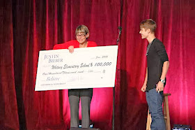 After promising to visit a school in need during his appearance on "Ellen" in November, Justin arrives at Whitney Elementary to high-five the students and hug the appreciative principal, Sherrie Gahn. "I can really see in your eyes that you really want to make a change and you really want to help these kids, and I admire you," the 17-year-old tells the principal.